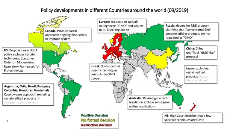Grøn viser, at landet har indført en regulering af NGT. Rød....